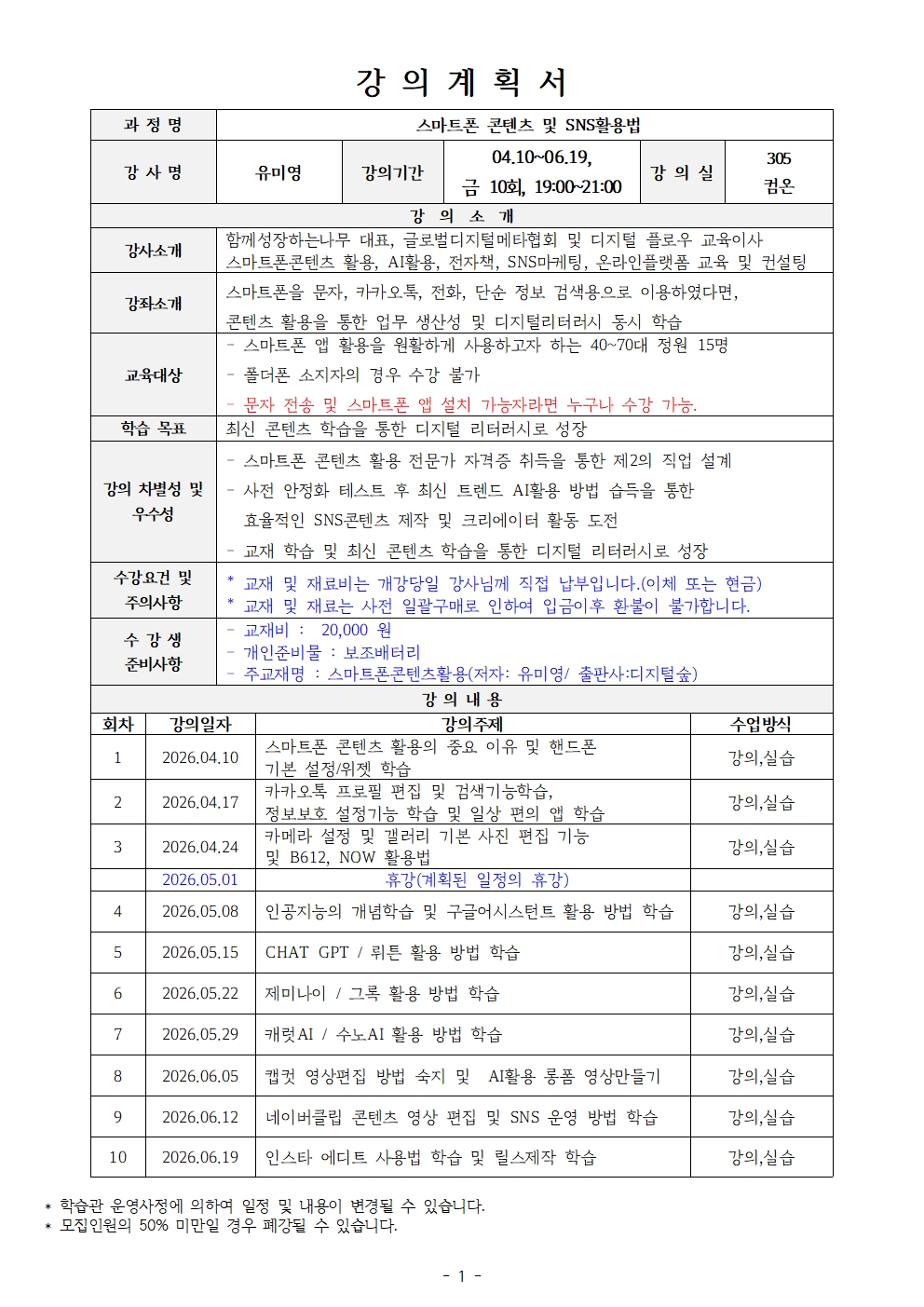 - 모집인원의 50% 미만일 경우 폐강될 수 있습니다.