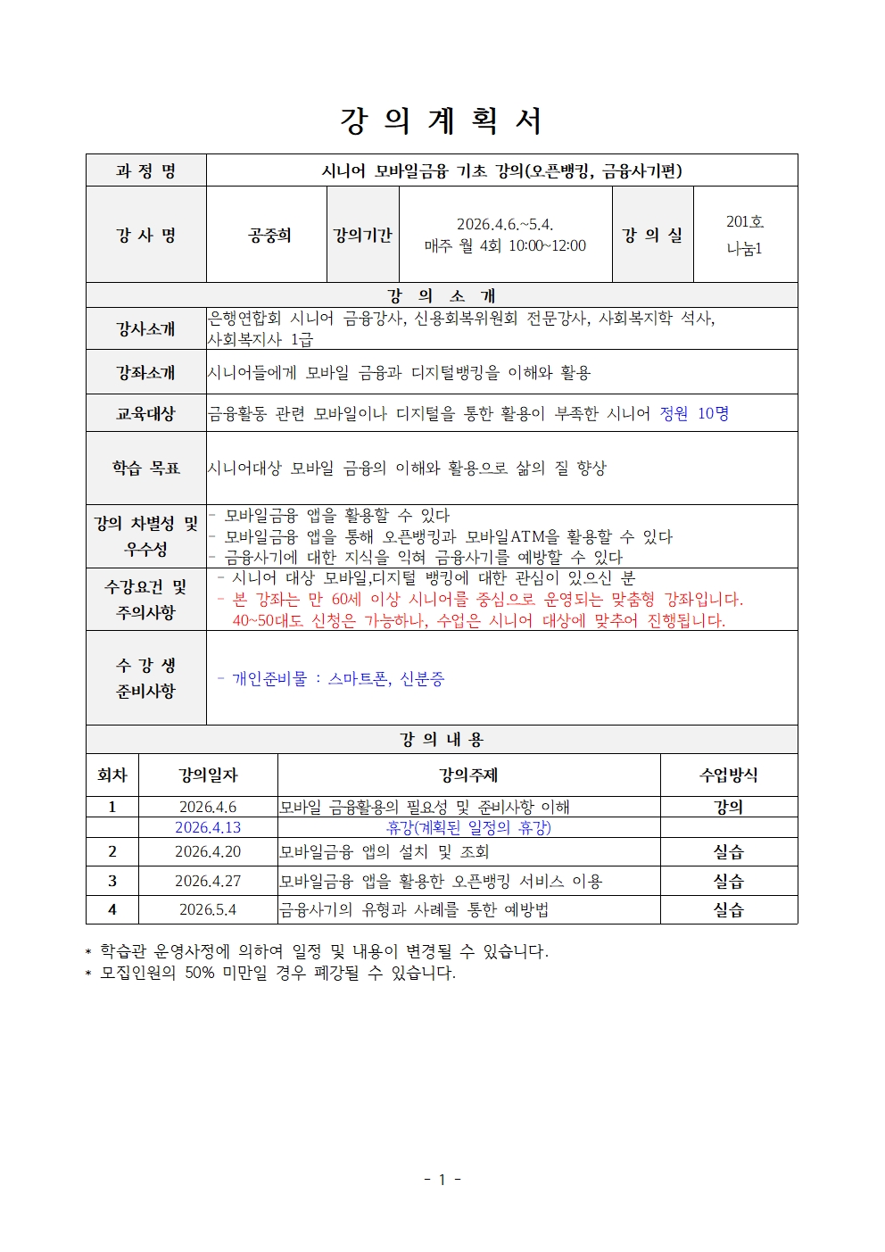 - 모집인원의 50% 미만일 경우 폐강될 수 있습니다.
