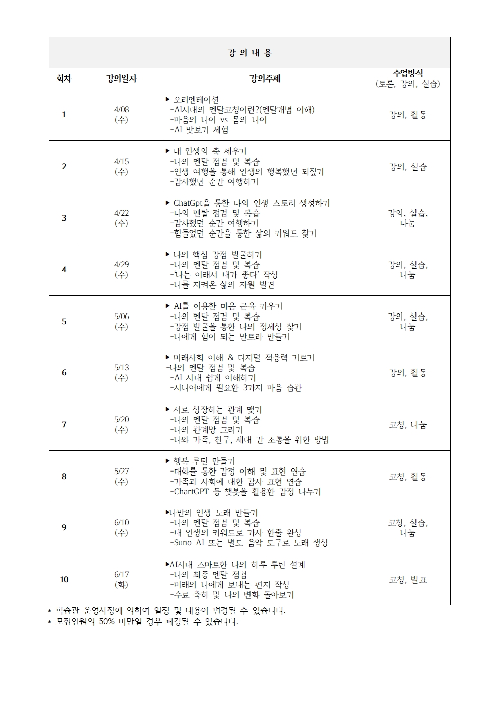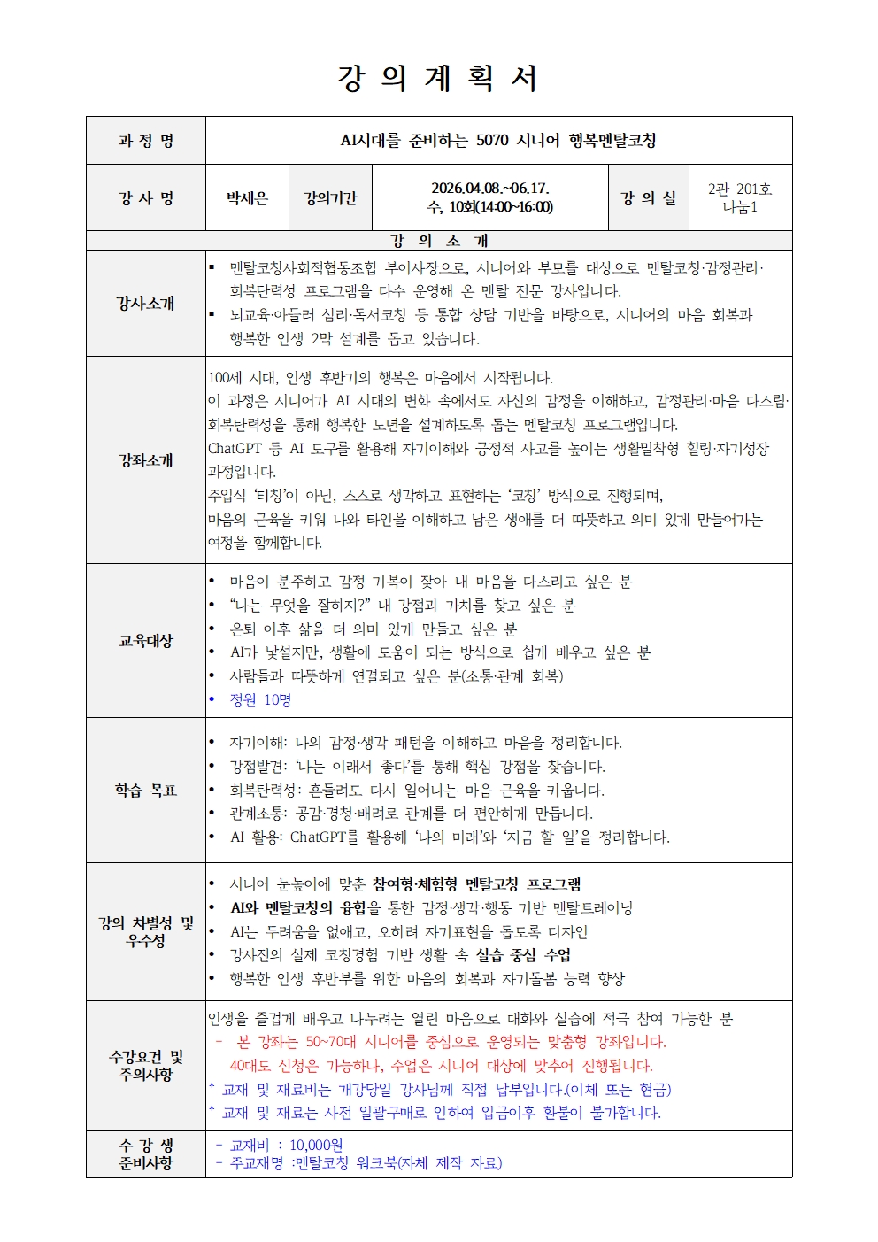 평생학습관 강좌 평생학습관 2026년 2분기 강좌 AI시대를 준비하는 5070 시니어 행복멘탈코칭(26년 2분기)3/25(수) 오전 10시부터 선착순 접수