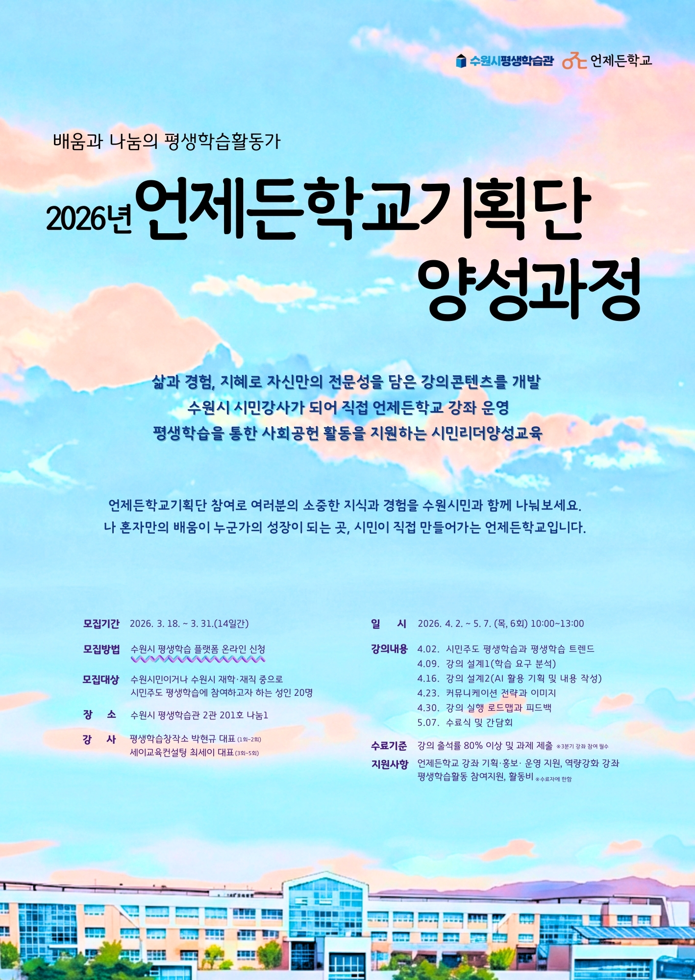 ※ 수료자 지원사항: 언제든학교 강좌 기획·홍보·운영 지원, 역량강화 강좌, 평생학습활동 참여지원, 활동비